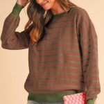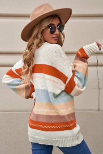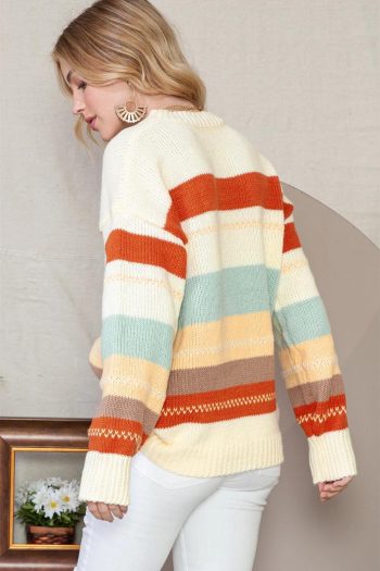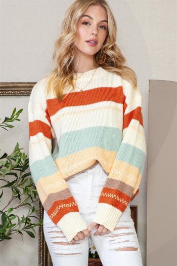 - Este suéter presenta mangas largas, cuello redondo y estampado de rayas y bloques de color.