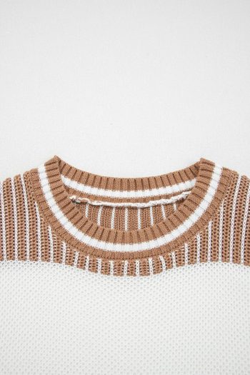 - Este suéter presenta mangas largas, cuello redondo y estampado de rayas y bloques de color.